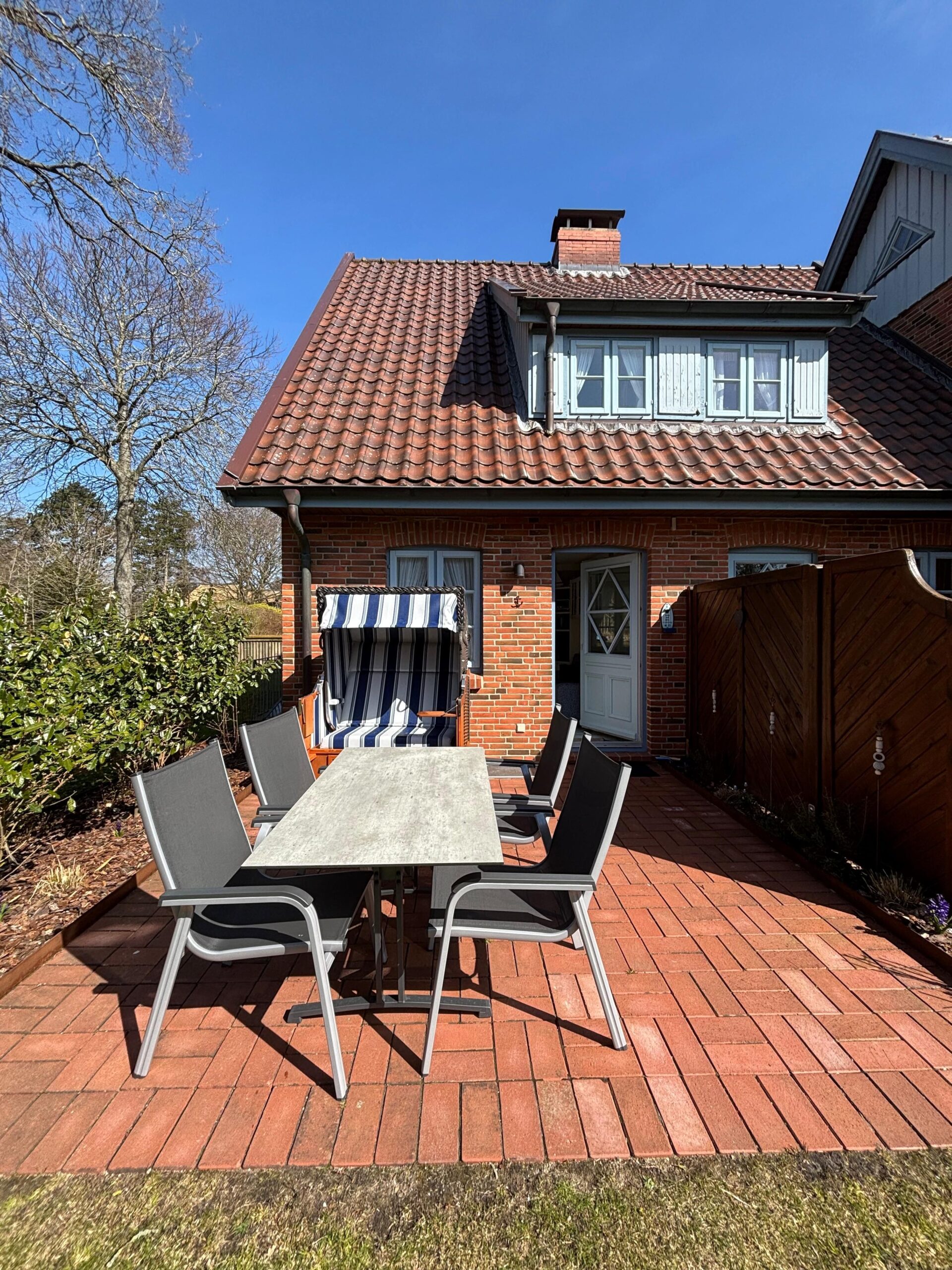 Nur 150 Meter vom Wyker Südstrand liegt, am Kurpark angrenzend, dieses gemütliche und familienfreundliche Ferienobjekt. Es handelt sich hierbei um insgesamt vier Doppelhaushälften. Das von uns angebotene Objekt ist die vordere Hausscheibe. Auf insgesamt 65qm steht Ihnen im Erdgeschoss des Hauses eine gut ausgestattete Küche (u.a. mit Spülmaschine, Mikrowelle und Backofen) und ein helles Wohnzimmer mit direktem Zugang zur Terrasse, auf der sich von Anfang April bis Mitte Oktober ein Strandkorb und Gartenmöbel mit Liege befinden, zur Verfügung. In der 1. Etage finden Sie ein Schlafzimmer mit Doppelbett (180x200) (es gibt zusätzlich Platz für ein Kinderreisebett), ein Gäste-WC und ein Duschbad mit Fenster vor. Über eine Treppe gelangen Sie ins Galeriezimmer, das mit 2 Einzelbetten (90x200) und Spielsachen für die kleinen Gäste ausgestattet ist. Für die größeren Gäste gibt es viele spannende Bücher, CDs, DVDs und ein Festnetztelefon (kostenfreie Nutzung ins deutsche Festnetz). Die Eigentümer haben bei der Einrichtung des Objektes auf hochwertige und Allergiker gerechte Ausstattung großen Wert gelegt. Ebenso wird die Kinderfreundlichkeit groß geschrieben. Treppengitter, Rausfallschutz, Babybett, Hochstuhl und Steckdosensicherungen sind vorhanden.