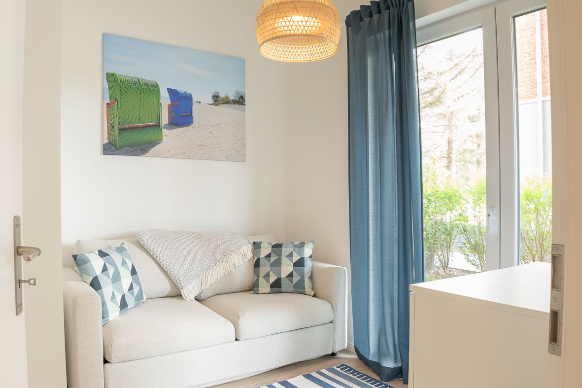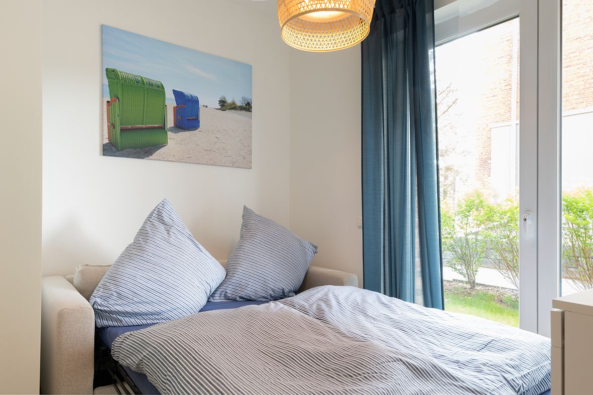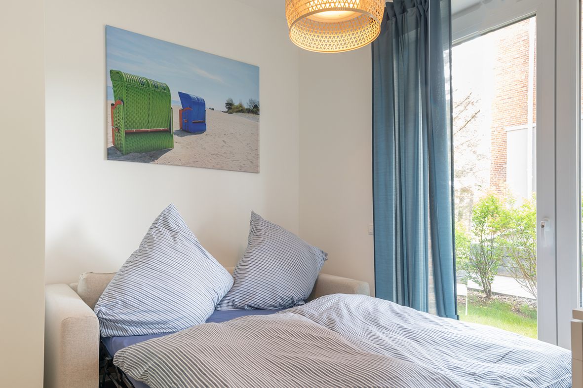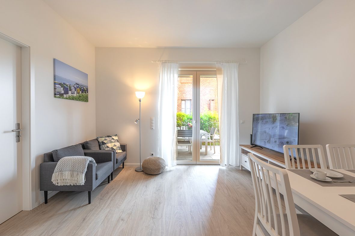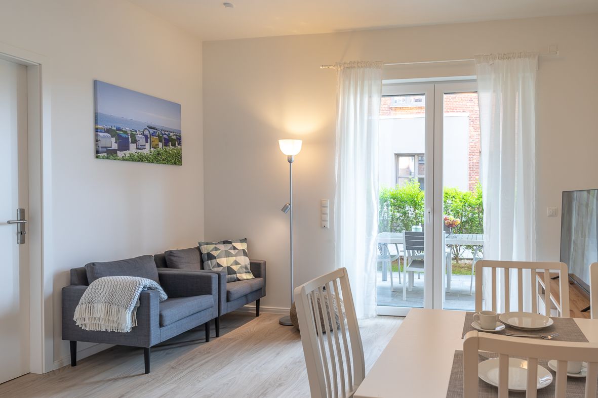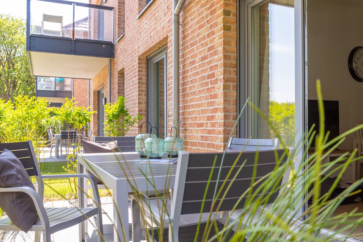 Eines der Highlights der Wohnung ist die angrenzende Terrasse, die mit hochwertigen Gartenmöbeln ausgestattet ist und zu gemütlichen Abenden im Freien einlädt. Hier können Sie die frische Luft genießen und sich nach einem langen Tag am Strand entspannen.