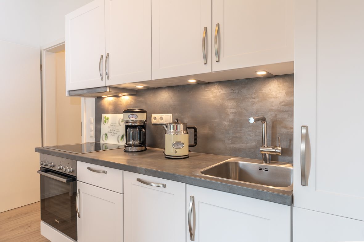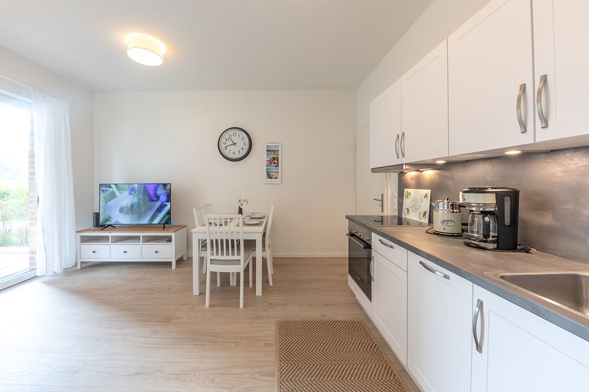Die 53 m² große Wohnung ist stilvoll eingerichtet und bietet Platz für bis zu 5 Personen (vier Erwachsene und ein Baby). Der Eingang befindet sich im westlichen Teil des Neubaus und führt direkt in den Wohn- und Essbereich, der mit einer modernen, gut ausgestatteten Küche verbunden ist. Hier finden Sie alles, was Sie für die Zubereitung leckerer Mahlzeiten benötigen, einschließlich Ceranfeld, Backofen und Kaffeemaschine. Die skandinavische Einrichtung harmoniert perfekt mit modernen Elementen und schafft eine einladende Atmosphäre.