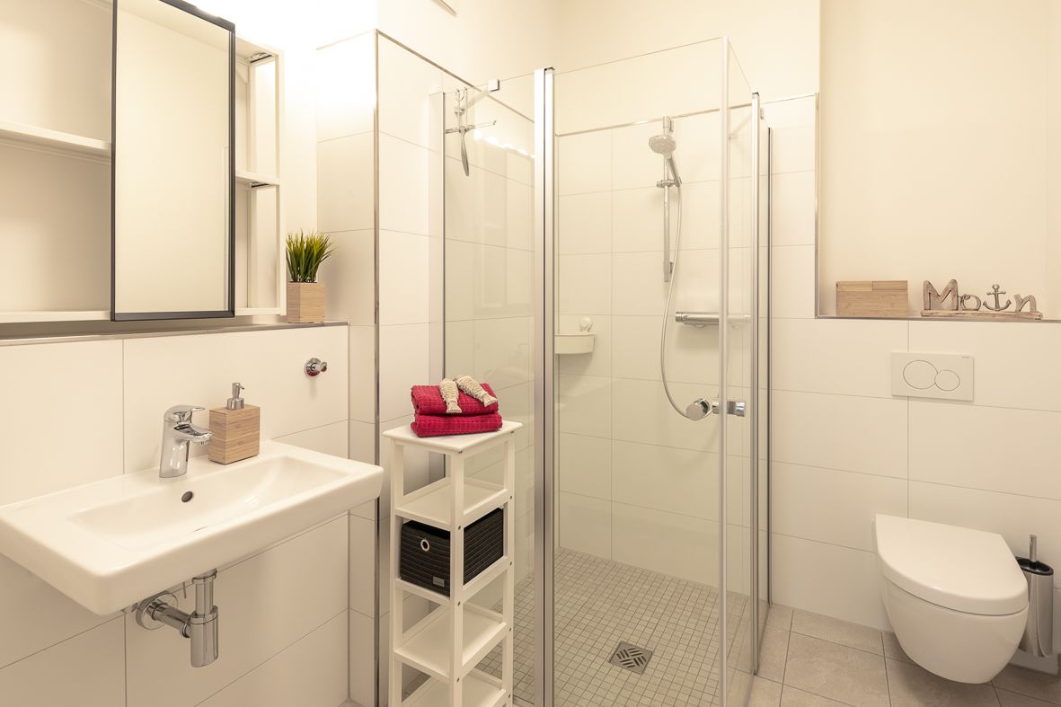 Das Badezimmer ist hell und modern gestaltet und verfügt über eine ebenerdige Dusche, die einen einfachen Zugang ermöglicht. Frische Handtücher und eine Grundausstattung an Pflegeprodukten stehen für Sie bereit.