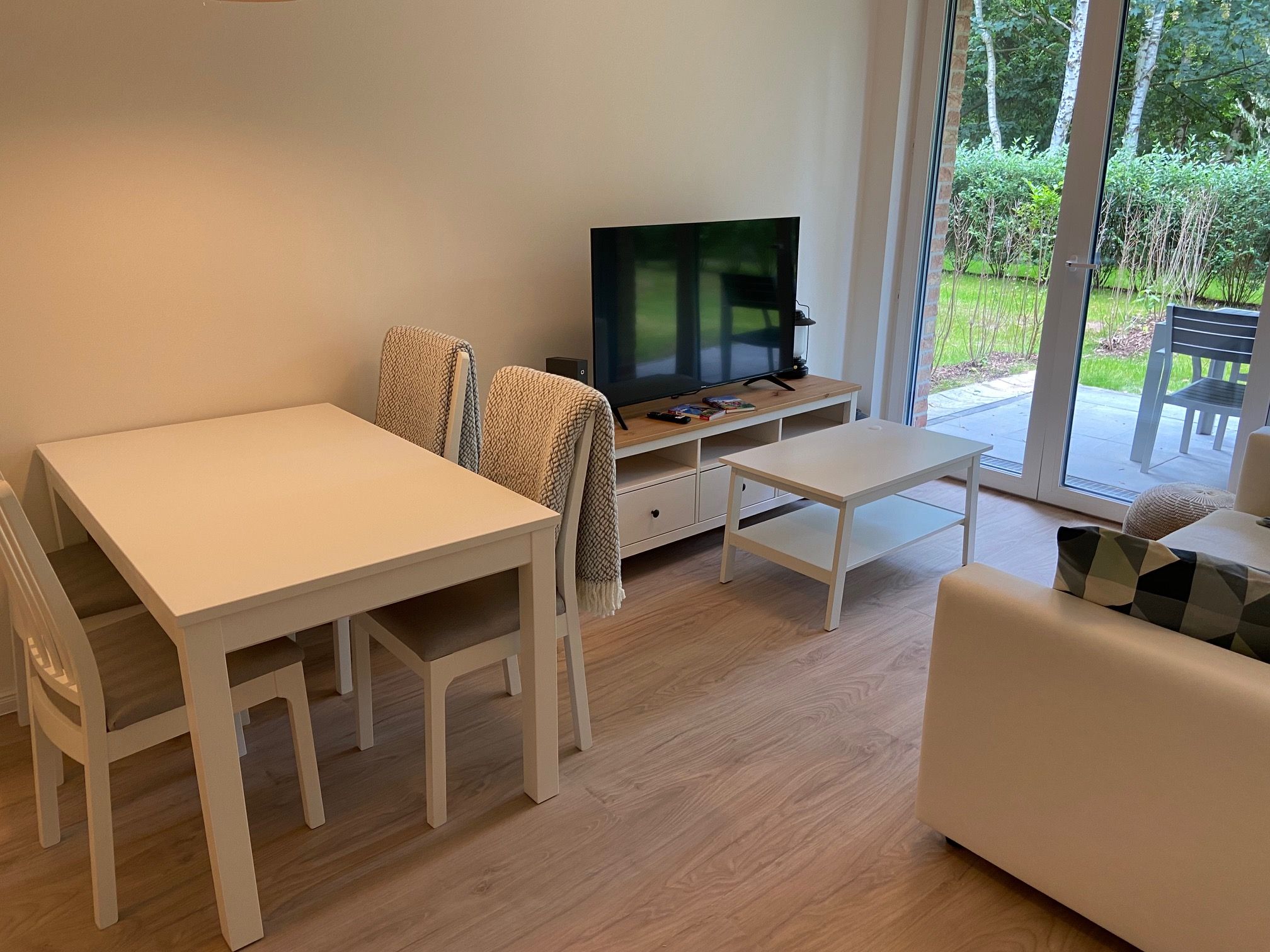 Die Erdgeschosswohnung ist modern und komfortabel eingerichtet und bietet auf großzügigen 56 m² Platz für bis zu 5 Personen (4 Personen und 1 Baby). Der offene Wohn- und Essbereich ist geschmackvoll gestaltet und lädt zum Entspannen ein. Die voll ausgestattete Küche mit Ceranfeld, Backofen und Kaffeemaschine lässt keine Wünsche offen und bietet Ihnen alles, was Sie für die Zubereitung Ihrer Lieblingsspeisen benötigen.