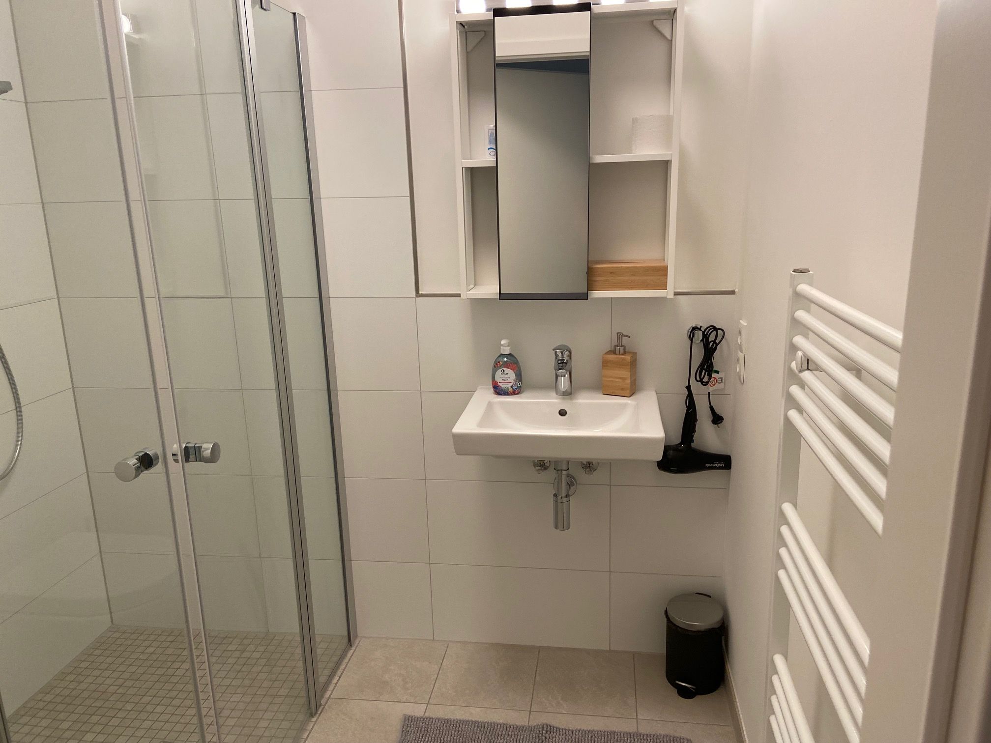 Das helle Duschbad ist modern gestaltet und verfügt über eine ebenerdige Dusche, die für barrierefreies Duschen sorgt. Selbstverständlich sind auch ein Flachbildfernseher und ein Internetzugang vorhanden.