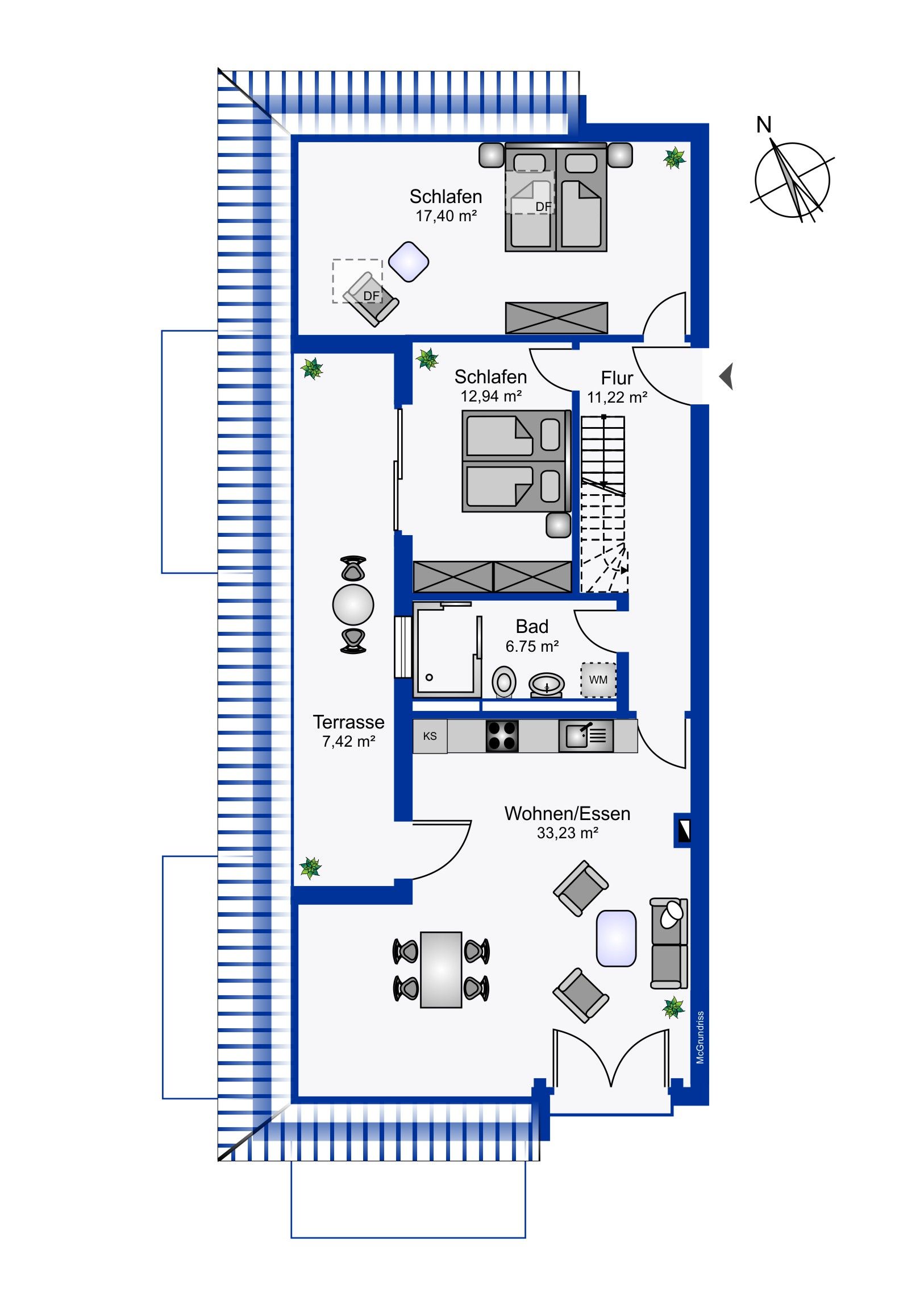 Die Ferienwohnung Teske auf Föhr ist ein echtes Highlight für Ihren nächsten Urlaub auf der Insel. Aufgeteilt auf zwei Ebenen und mit insgesamt 100m² Wohnfläche bietet die Wohnung genügend Platz für bis zu 6 Personen (4 Personen und 2 Babys). Liebevoll eingerichtet und mit skandinavischen Elementen versehen, verbindet die Wohnung modernes Design mit Gemütlichkeit und Komfort.