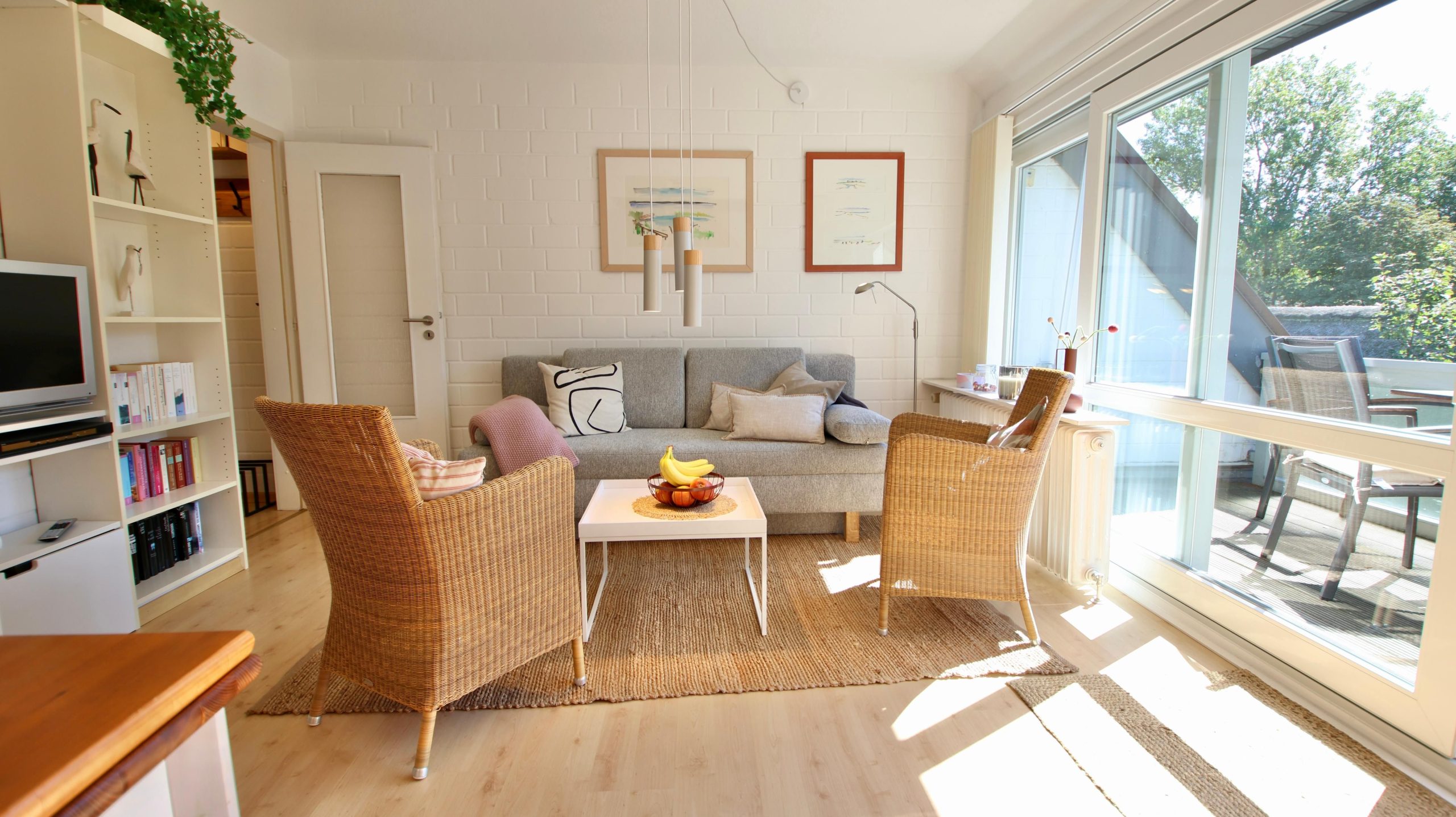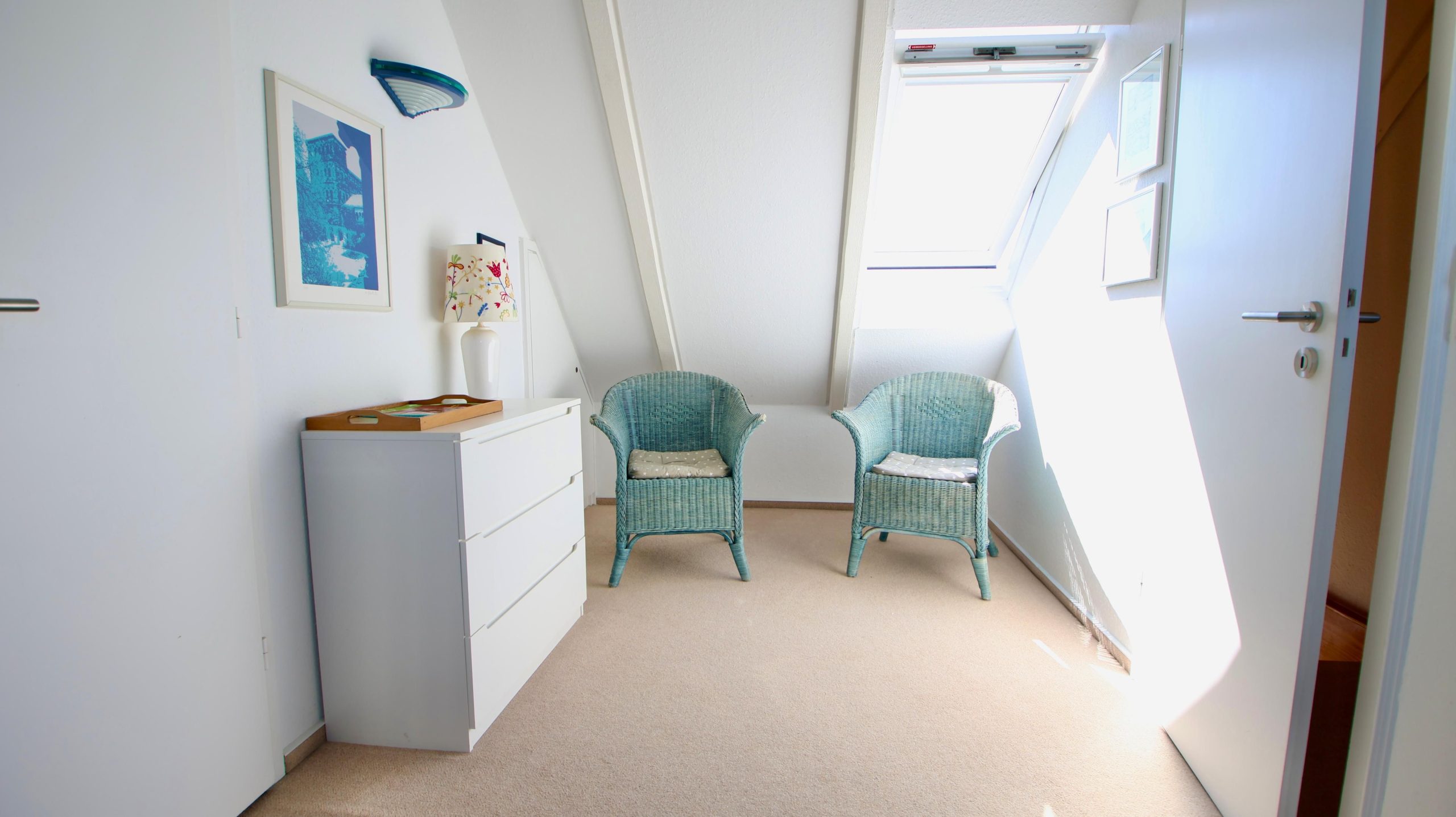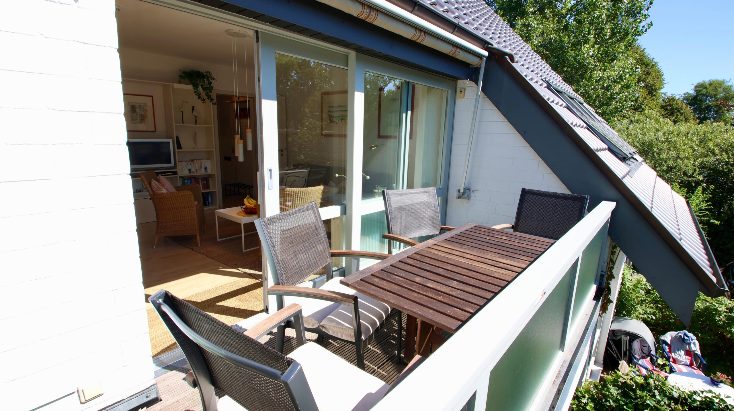 Helle 3-Zimmer-Ferienwohnung im Obergeschoss mit sonnigem Balkon. Die individuelle Wohnung verfügt über einen gemütlichen Wohn- Essbereich mit Zugang zur kleinen, aber gut ausgestatteten Küche. Der Balkon, der mit einer großen Markise versehen ist, erreichen Sie über den Wohn-Essbereich. Auf dieser Ebene befindet sich das Schlafzimmer mit zwei einzelnen Betten....