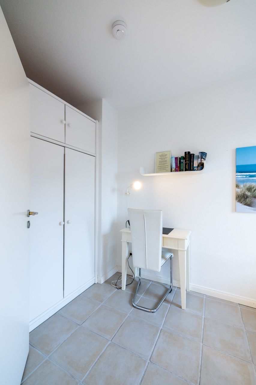 Die Wohnung selbst liegt in der 2. Etage mit überdachtem Balkon. Besonders hervorzuheben ist der direkte Blick auf das Meer Richtung Osten. Hier lassen sich die eigenen Kinder beim Spielen beobachten.